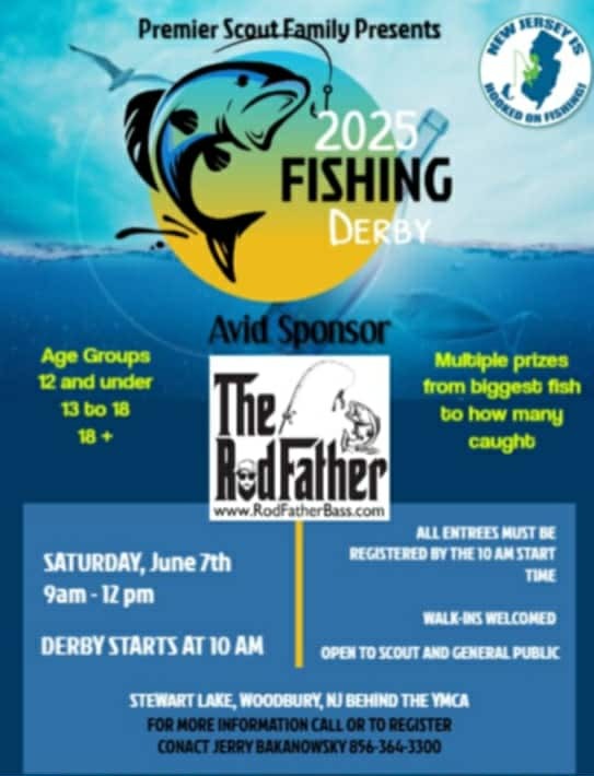 6.) On Saturday 6/7/2025 from 9am-12am at Stewart Lake in Woodbury, NJ, we will be volunteering with an estimated 100 kids for The Premier Scout Family Youth Fishing Derby OPEN to THE PUBLIC! Lots of PRIZES & FUN!